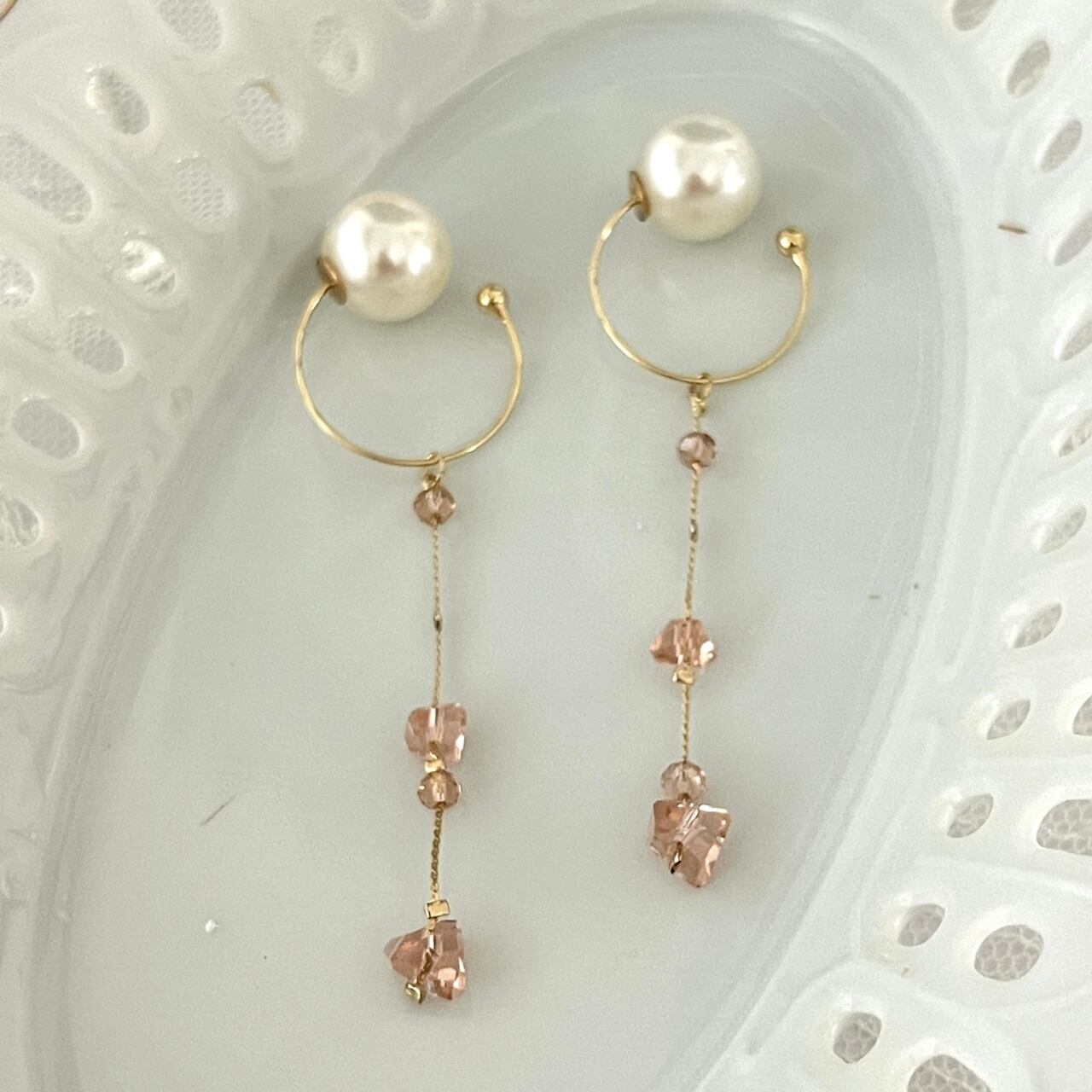 【ピンク系のカットビーズ×ホワイトパール】イヤーカフ/ゴールド/チャームタイプ[4-1]