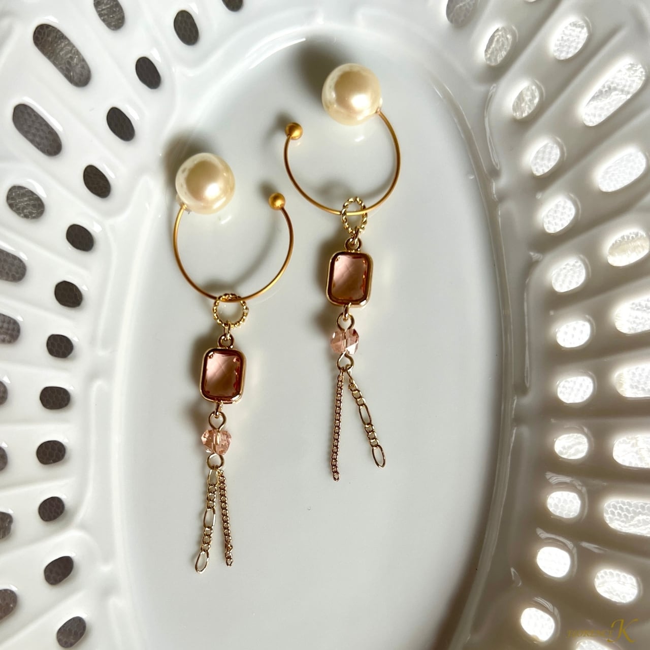 繊細にカットされたローズカラーのスクエアクリスタル、